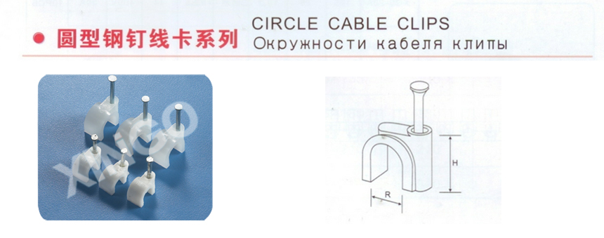 材质:采用PP材料制成,附钢钉。 使用方法:将电线置于卡内,用铁锤将钢钉钉上墙壁上即可将电线固定。 用途:一般室内配线固定电线用。 Material:PP,Steel nail. How to use:Put the cable under the clip and hammer the nail into the wall to sccure the cable. Application:Securing of calbes for general indoor wiring.