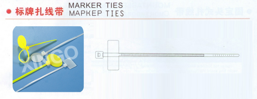 材质:UL认可之尼龙66料制成,防火等级94V-2.耐腐蚀,不易老化。 特点:扎带前端设有空白标牌,可用笔在上面标志记号 Material:Nylon 66 94V-2 certificated by UL.Acid-control and not easy to age. Usage:No blank tag at the entrance of cable tie,then write down the marker on the tag.